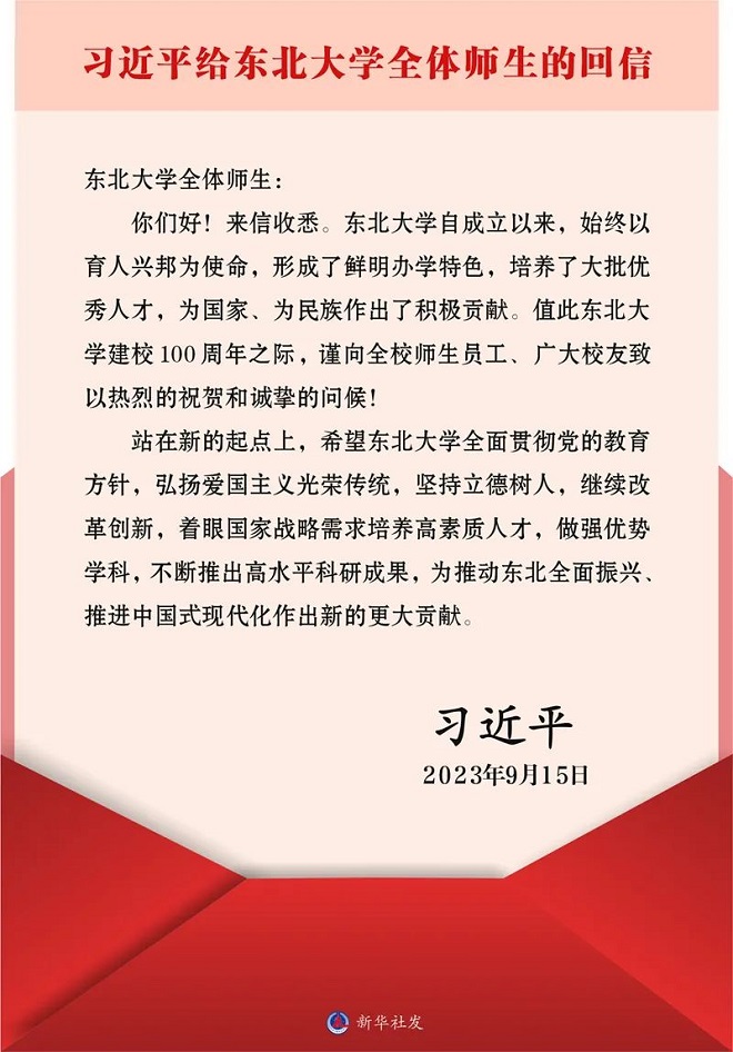 新華社北京9月16日電 中共中央總書記、國家主席、中央軍委主席習近平9月15日給東北大學全體師生回信,在東北大學建校100周年之際,向全校師生員工、廣大校友致以熱烈的祝賀和誠摯的問候。