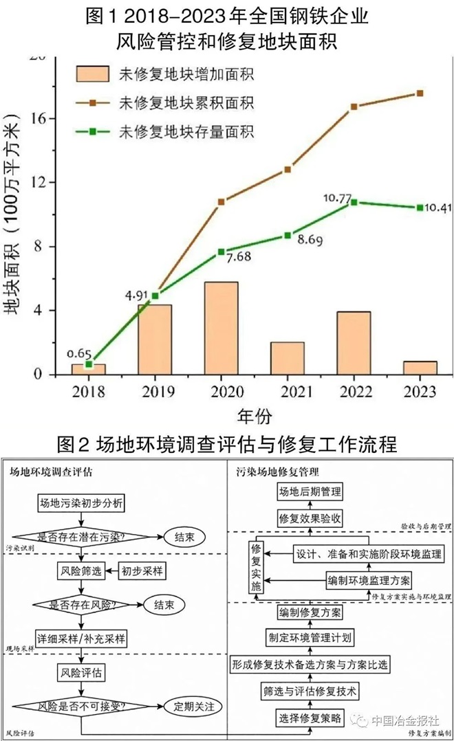 根據全國31個?。ㄗ灾螀^、直轄市)最新公布的建設用地土壤污染風險管控和修復名錄(見圖1),2023年全國鋼鐵企業風險管控和修復地塊總面積為1756.85萬平方米,已完成風險管控和修復的地塊面積為715.52萬平方米,占總面積的40.73%;2022年后,未完成風險管控和修復的存量地塊面積呈現下降趨勢。可以看出,鋼鐵企業正在積極打響凈土保衛戰,治理和修復工作已取得一定成果。