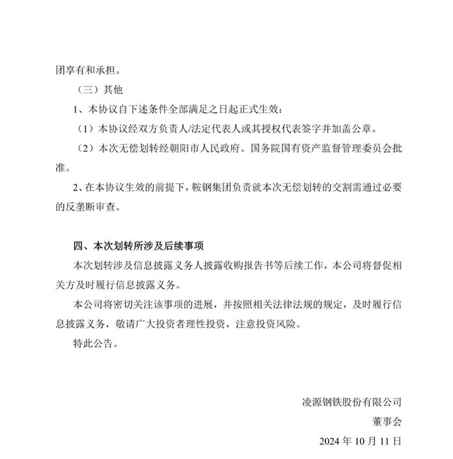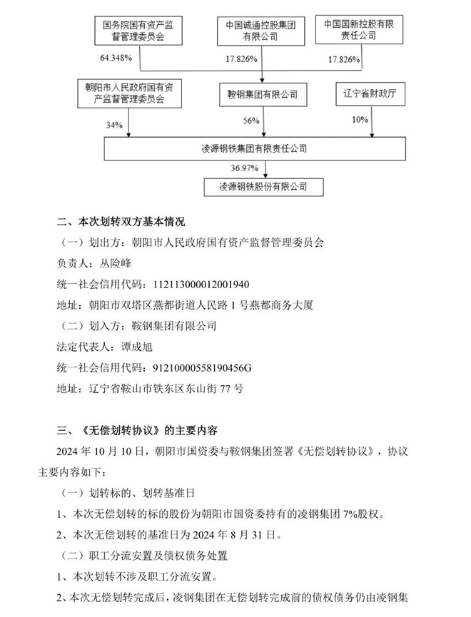 凌鋼股份10月10日晚間發布公告稱,朝陽市國資委與鞍鋼集團簽署《無償劃轉協議》,約定朝陽市國資委將向鞍鋼集團無償劃轉其持有的凌鋼集團 7%股權。本次劃轉已取得朝陽市人民政府的批準,尚需國務院國資委批準。