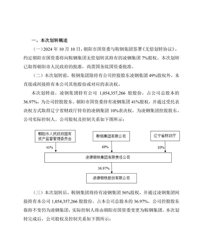 本次劃轉完成后,鞍鋼集團將持有凌鋼集團 56%股權,成為凌鋼集團控股股東,鞍鋼集團將通過凌鋼集團間接控制公司 1,054,357,266 股股份,占公司總股本的36.97%。公司控股股東保持不變仍為凌鋼集團,實際控制人將由朝陽市國資委變更為鞍鋼集團。