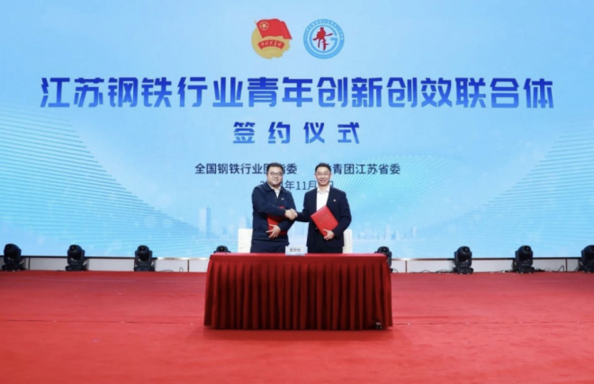 圖為江蘇鋼鐵行業(yè)青年創(chuàng)新創(chuàng)效聯(lián)合體簽約儀式