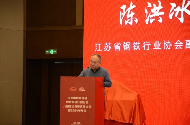 圖為江蘇省鋼鐵行業協會副會長兼秘書長陳洪冰致辭。