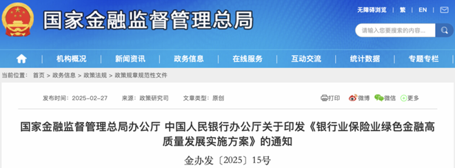 2月27日,國家金融監(jiān)督管理總局、中國人民銀行聯(lián)合發(fā)布《銀行業(yè)保險業(yè)綠色金融高質(zhì)量發(fā)展實施方案》(以下簡稱《實施方案》)。