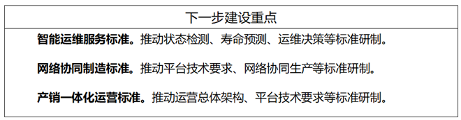 大規模個性化定制標準主要包括通用要求、需求交互要求、設計要求、生產要求等標準;智能運維服務標準主要包括通用要求、數據接口、狀態監測、故障診斷、壽命預測、運維決策等標準;網絡協同制造標準主要包括平臺技術要求、資源模型要求、協同經營管理、網絡協同設計、網絡協同生產等標準;產銷一體化運營主要包括運營總體架構、平臺技術要求、數據分類規范等標準;其他主要包括上述四類以外的智能制造新模式的通用要求和服務交付等標準。