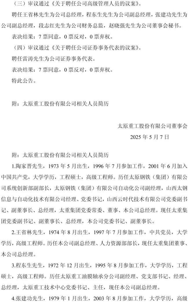 5月7日,太原重工發(fā)布公告稱,2025年5月6日,第十屆董事會第一次會議審議通過《關(guān)于選舉第十屆董事會董事長的議案》,選舉陶家晉先生為公司第十屆董事會董事長。