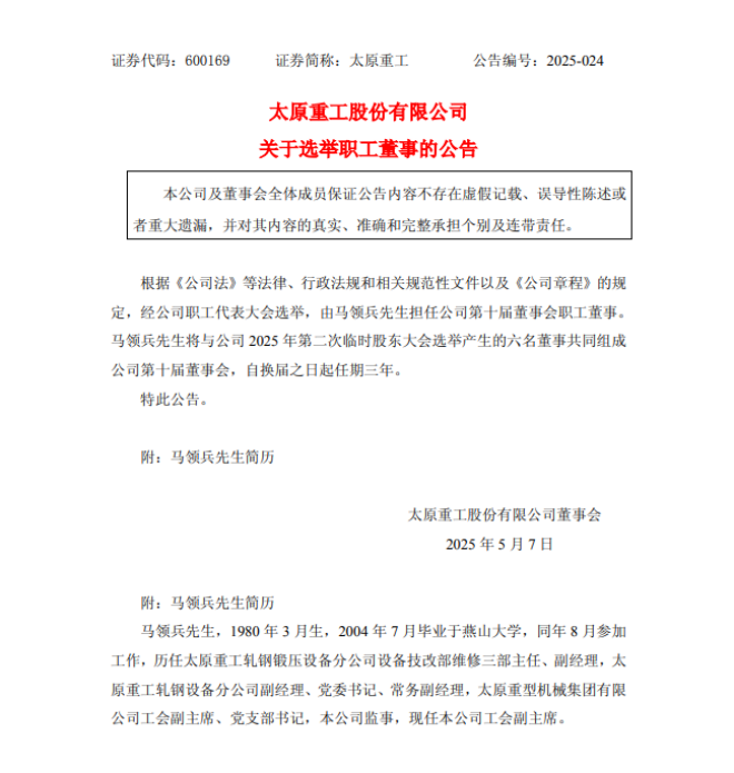 5月7日,太原重工發(fā)布公告,經(jīng)公司職工代表大會選舉,由馬領(lǐng)兵先生擔(dān)任公司第十屆董事會職工董事。馬領(lǐng)兵先生將與公司 2025 年第二次臨時股東大會選舉產(chǎn)生的六名董事共同組成公司第十屆董事會,自換屆之日起任期三年。