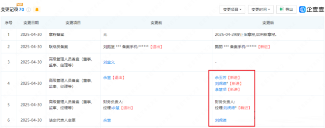 高級管理人員備案(董事、監(jiān)事、經(jīng)理等):劉金文退出,財(cái)務(wù)負(fù)責(zé)人、經(jīng)理余慧退出,新進(jìn)李慧明、余玉芳、劉虎德,劉虎德?lián)谓?jīng)理。