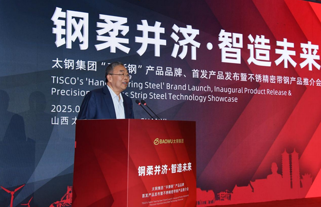田志凌在致辭中表示,長期以來,太鋼作為我國鋼鐵工業(yè)創(chuàng)新發(fā)展的明星企業(yè),始終發(fā)揮著創(chuàng)新發(fā)展的引領(lǐng)者和示范者的重要角色作用。在新時代高質(zhì)量發(fā)展的推動下,高強度、長壽命、輕量化、耐腐蝕等優(yōu)異性能,日益成為鋼鐵新材料的發(fā)展方向。太鋼“手撕鋼”產(chǎn)品的研發(fā)和逐步系列化,正在深刻改變著鋼鐵生產(chǎn)的生態(tài),推動著用鋼行業(yè)企業(yè)的轉(zhuǎn)型升級和產(chǎn)業(yè)變革,也在很大程度上代表著中國鋼鐵工業(yè)轉(zhuǎn)型升級、高質(zhì)量發(fā)展的趨勢和方向。
