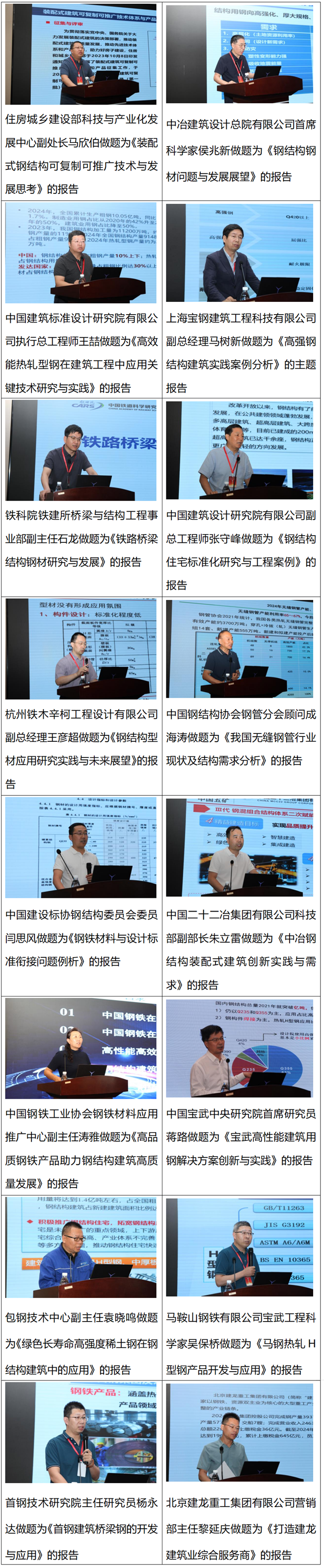 隨后,16位業(yè)內(nèi)專家圍繞裝配式鋼結(jié)構(gòu)可復(fù)制可推廣技術(shù)、高強鋼結(jié)構(gòu)建筑實踐案例、鋼結(jié)構(gòu)住宅標(biāo)準(zhǔn)化研究、鋼鐵材料與設(shè)計標(biāo)準(zhǔn)銜接問題、鐵路橋梁結(jié)構(gòu)鋼材研究與發(fā)展等產(chǎn)業(yè)鏈熱點話題做主旨報告。