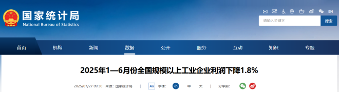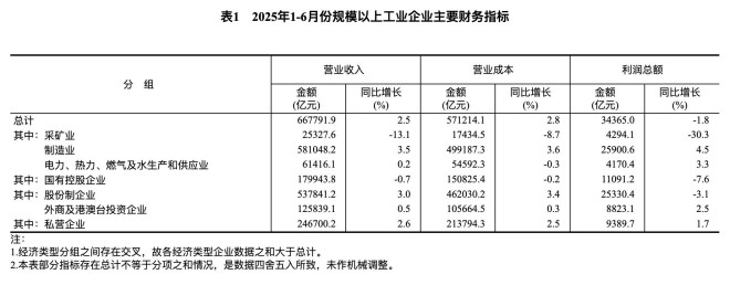 7月27日,從國家統計局獲悉,1—6月份,全國規模以上工業企業實現利潤總額34365.0億元,同比下降1.8%。