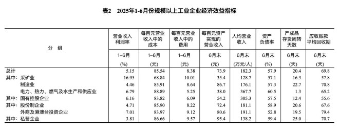 6月末,規模以上工業企業每百元資產實現的營業收入為73.9元,同比減少1.9元;人均營業收入為182.3萬元,同比增加5.6萬元;產成品存貨周轉天數為20.4天,同比增加0.1天;應收賬款平均回收期為69.8天,同比增加3.9天。