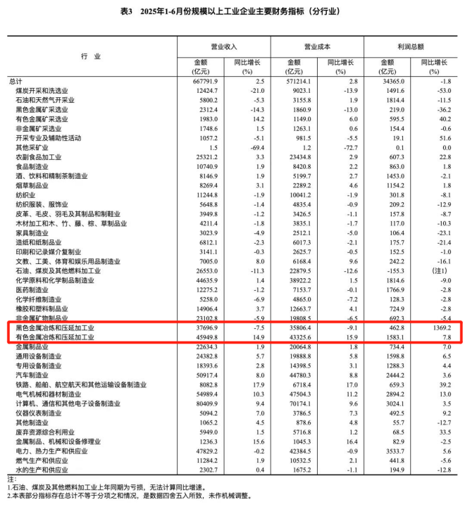 1—6月份,主要行業利潤情況如下:黑色金屬冶煉和壓延加工業利潤同比增長13.7倍,農副食品加工業增長22.8%,電氣機械和器材制造業增長13.0%,有色金屬冶煉和壓延加工業增長7.8%,通用設備制造業增長6.5%,電力、熱力生產和供應業增長5.6%,專用設備制造業增長4.4%,汽車制造業增長3.6%,計算機、通信和其他電子設備制造業增長3.5%,非金屬礦物制品業下降5.4%,紡織業下降8.1%,化學原料和化學制品制造業下降9.0%,石油和天然氣開采業下降11.5%,煤炭開采和洗選業下降53.0%,石油、煤炭及其他燃料加工業同比增虧。