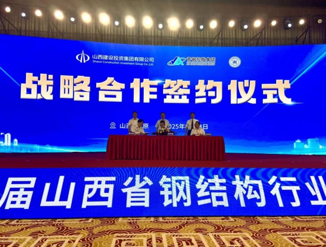 在簽約環節,晉鋼控股集團與15家產業鏈合作伙伴簽約,山西省鋼結構協會、晉鋼控股集團、山西建投3家單位簽署戰略合作協議,晉鋼控股集團機場建設專用高端氟碳彩涂板品牌發布。