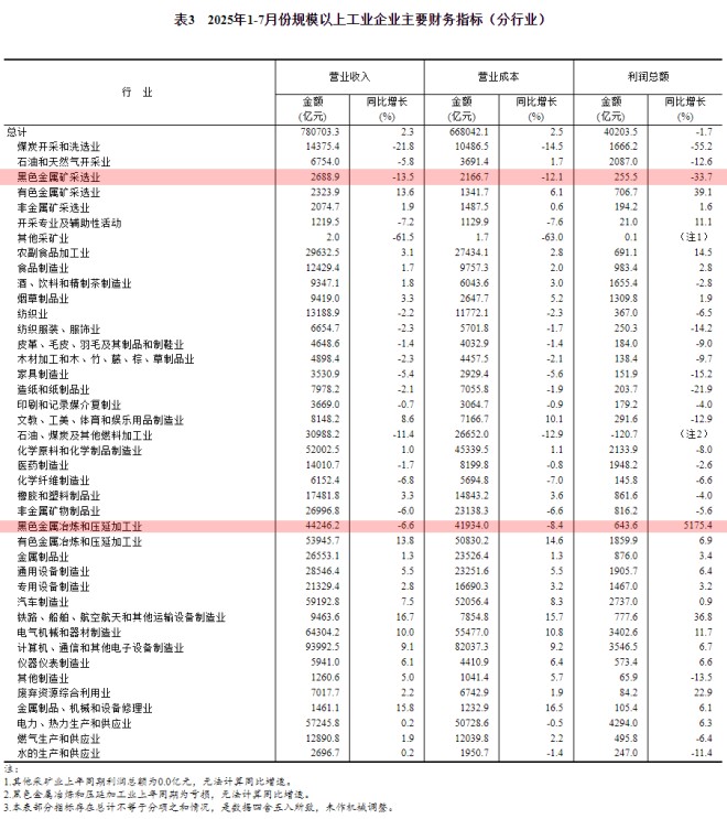 黑色金屬冶煉和壓延加工業1-7月份利潤總額643.6億元,同比增長5175.4%