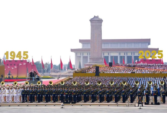 2025年9月3日,紀念中國人民抗日戰爭暨世界反法西斯戰爭勝利80周年大會在北京隆重舉行。這是中國人民解放軍聯合軍樂團和觀禮的嘉賓。新華社記者 鞠煥宗 攝