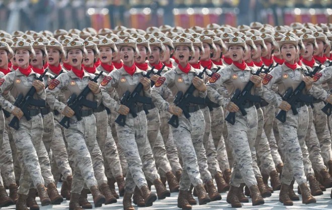 民兵方隊英姿颯爽,受閱女民兵來自當年全國主要抗日根據地。