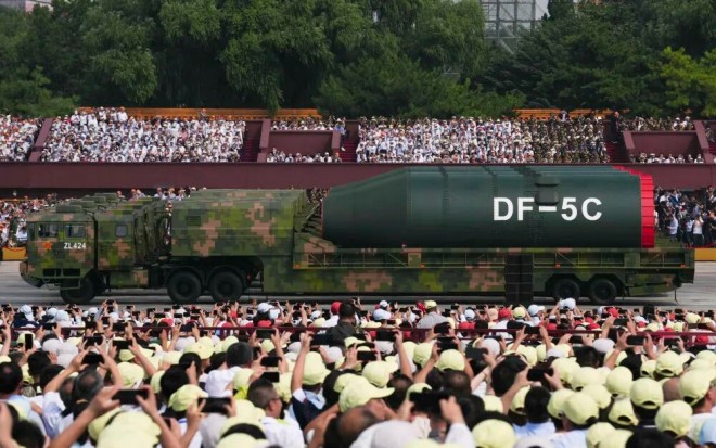 鐵流浩蕩,威震寰宇。“東風-5C”液體洲際戰略核導彈是鑄就和平盾牌的戰略利器,在裝備方隊壓軸出場時,全場響起歡呼聲。