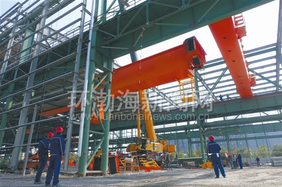 圖為承擔建設任務的中國五冶集團正在吊裝巨型天車。