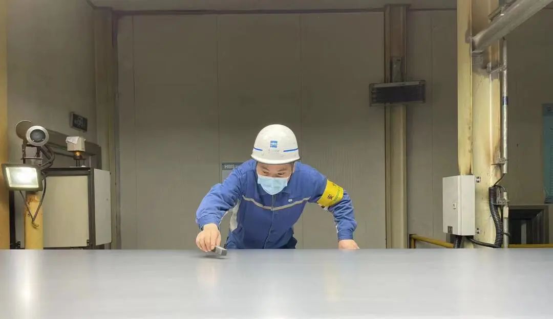 接到反饋后,王永恒連忙趕到質檢室,對著樣板反復查看。結合以往經驗,他判斷為邊部小細道劃傷。“把圓盤剪間隙調整后再試一下。”按照王永恒的要求,工藝操作人員張宏偉盯著圓盤剪碼盤,按照標準化操作規程,一圈一圈地調整剪刃間隙,將間隙由原來的 0.03mm 調整為0.02mm。十幾分鐘后,第二卷下線,按照要求進行取樣。