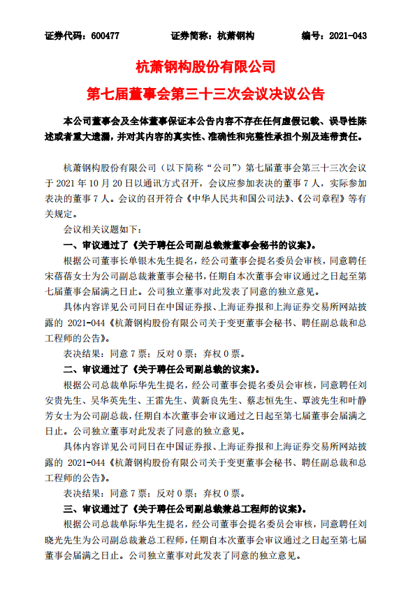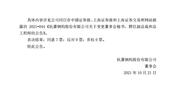 杭蕭鋼構第七屆董事會第三十三次會議決議公告