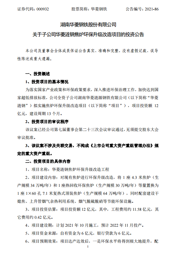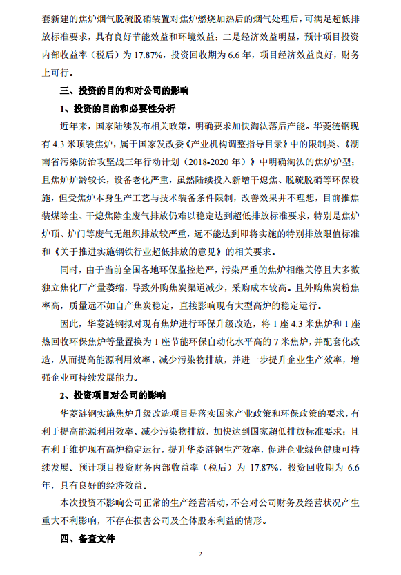 華菱鋼鐵:關(guān)于子公司華菱漣鋼焦?fàn)t環(huán)保升級(jí)改造項(xiàng)目的投資公告