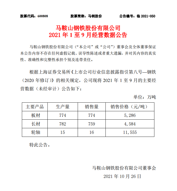 馬鞍山鋼鐵股份有限公司2021年1至9月經營數據公告