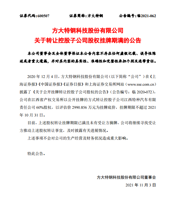 方大特鋼關于轉讓控股子公司股權掛牌期滿的公告