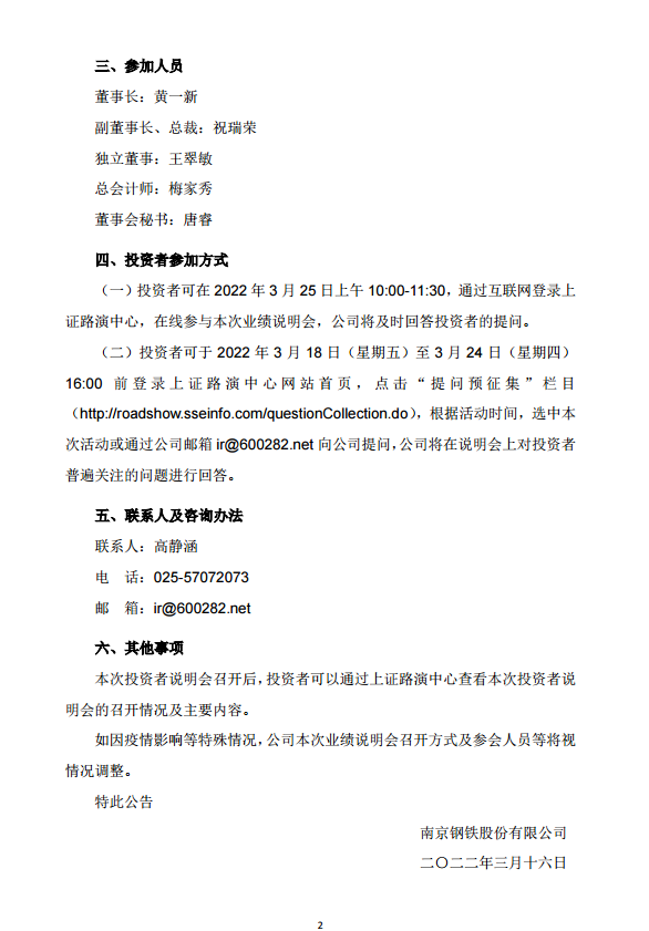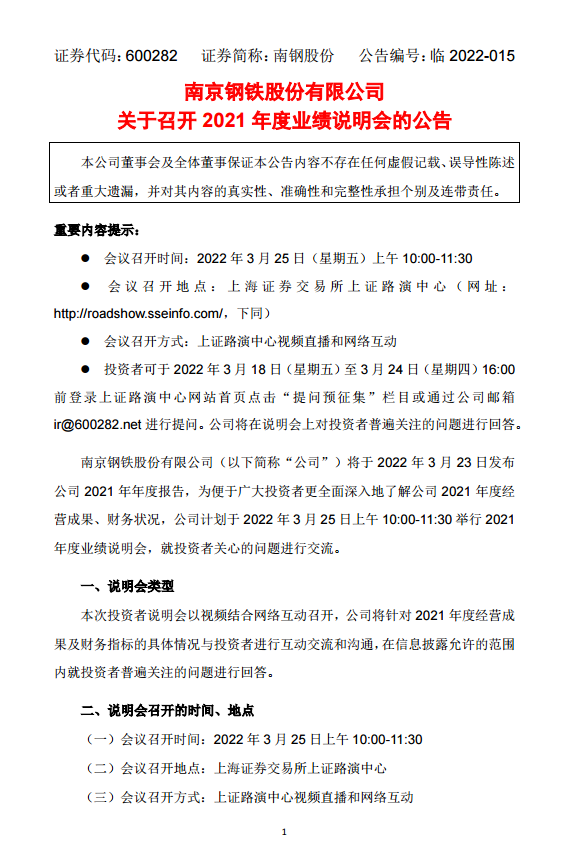 南京鋼鐵股份有限公司關于召開2021年度業績說明會的公告