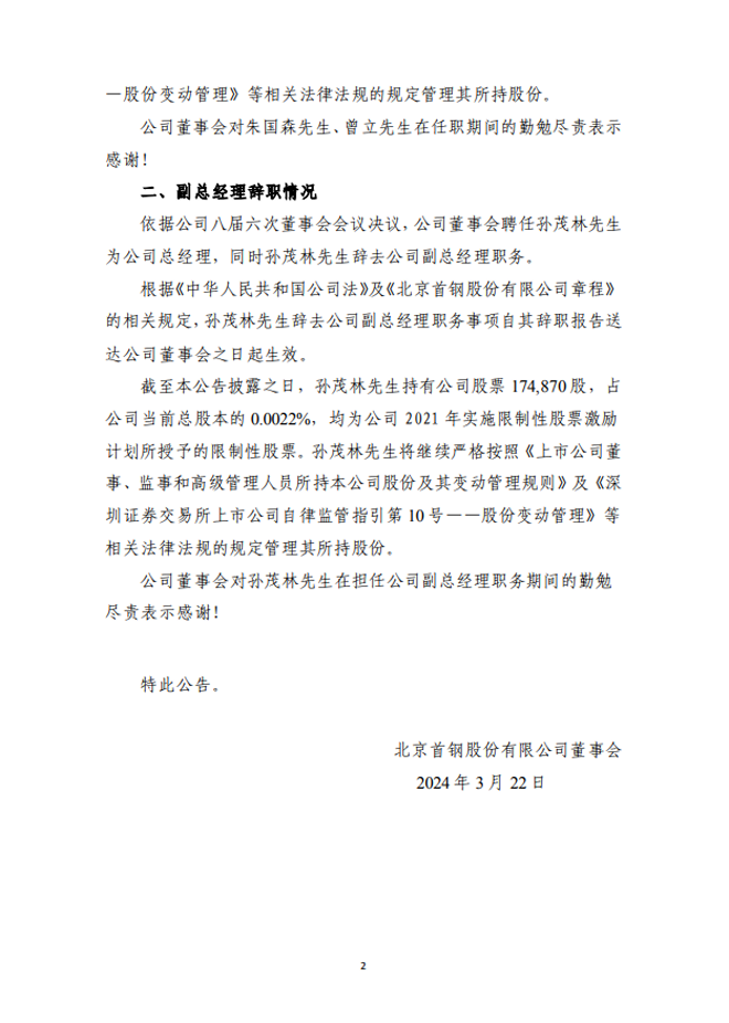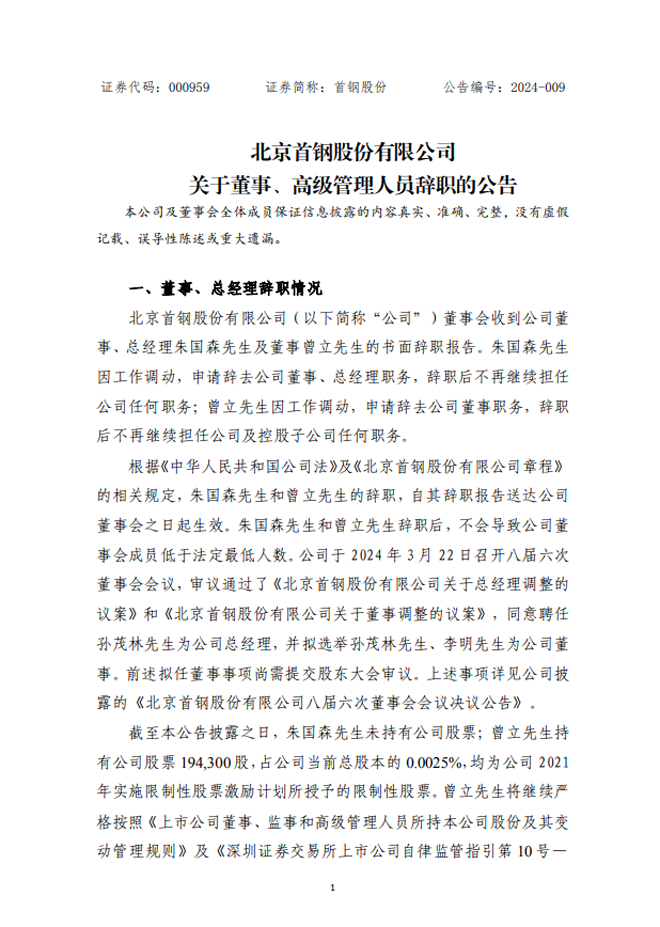 首鋼股份:北京首鋼股份有限公司關于董事、高級管理人員辭職的公告