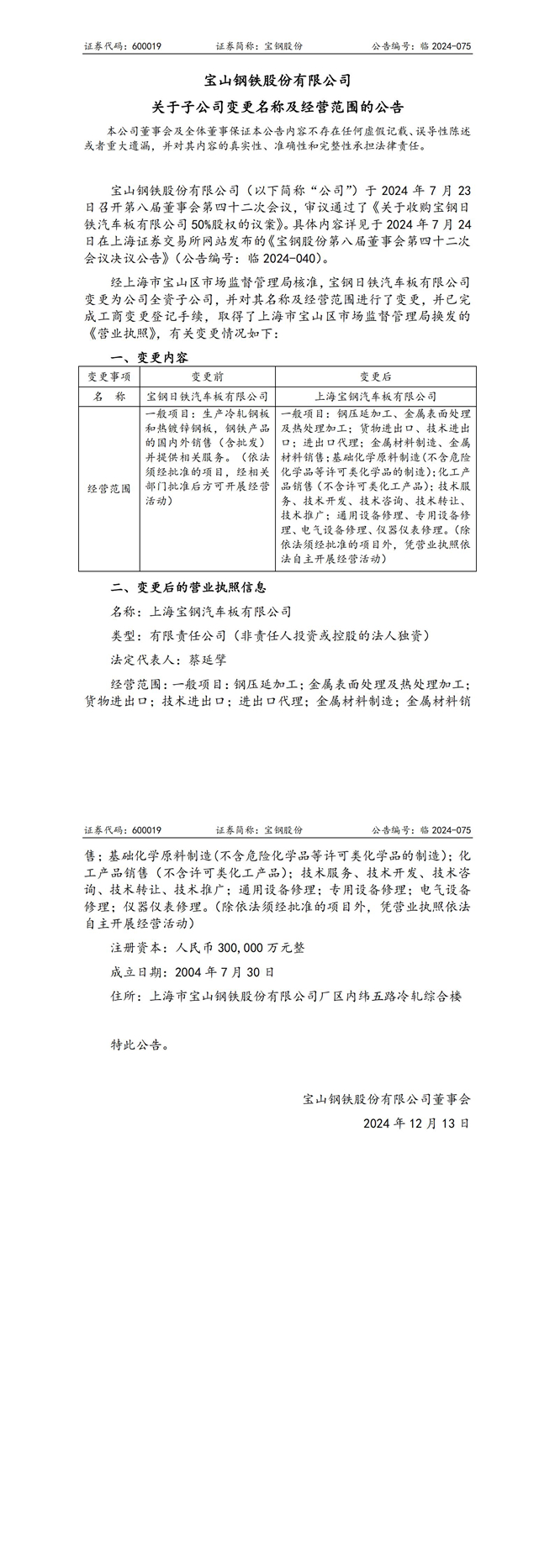 寶鋼股份:寶鋼股份關于子公司變更名稱及經營范圍的公告