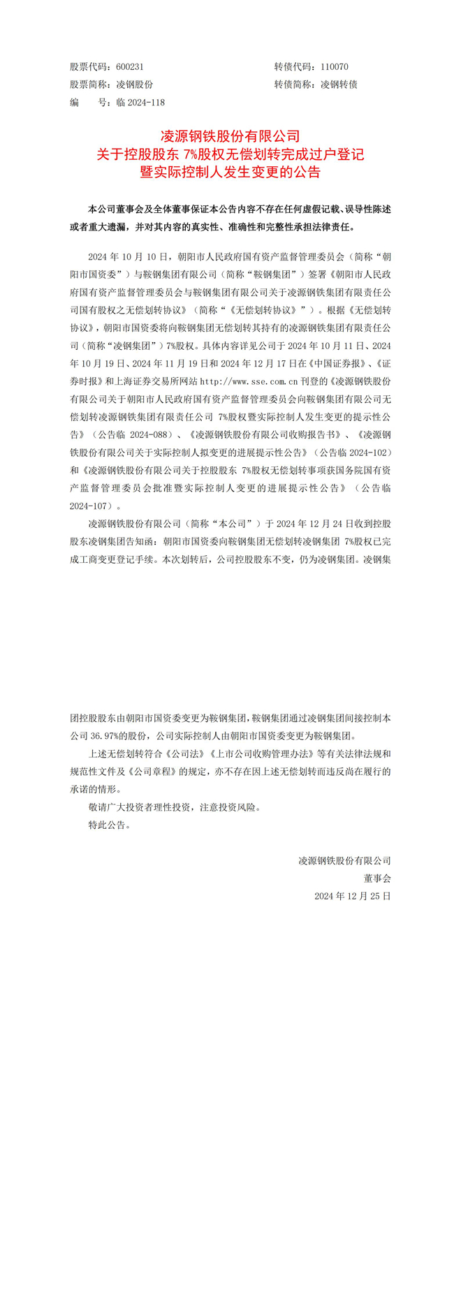 凌鋼股份:凌源鋼鐵股份有限公司關于控股股東7%股權無償劃轉完成過戶登記暨實際控制人發(fā)生變更的公告