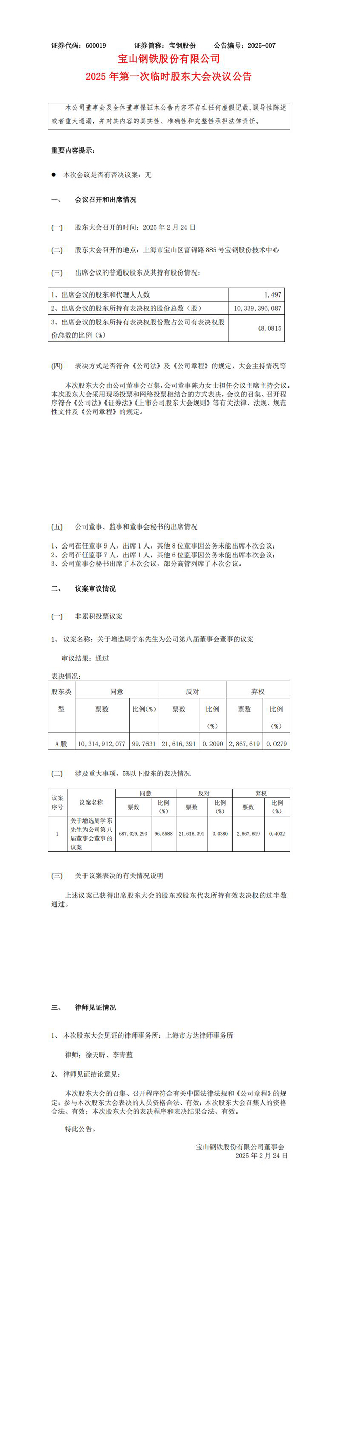 寶鋼股份:寶鋼股份2025年第一次臨時股東大會決議公告