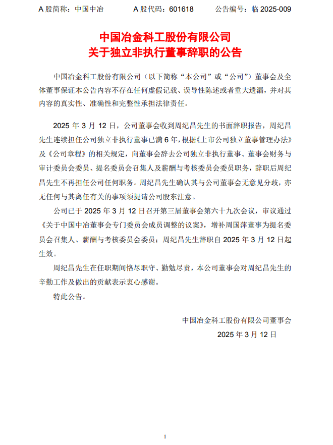 中國中冶:中國中冶關于獨立非執行董事辭職的公告