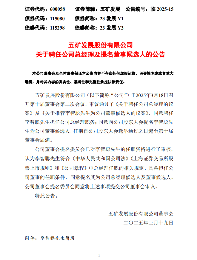 五礦發展:五礦發展股份有限公司關于聘任公司總經理及提名董事候選人的公告