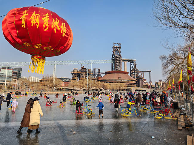 2025年新春佳節,首鋼園精心打造了一系列豐富多彩的新春活動,吸引了眾多市民和游客的目光。據統計,從除夕至大年初七,首鋼園共接待游客28萬余人次,同比增長超30%,其中大年初一單日游客量達到5.4萬人次。圖為游客 在首鋼秀冰場上滑冰,感受冰雪帶來的別樣年味。(袁德祥攝)