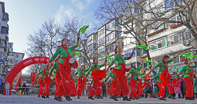 2月12日,中國寶武太鋼集團的退休職工們齊聚一堂,以自編自演的文藝節目,用載歌載舞的方式歡慶元宵佳節。圖為太鋼退休職工在山西省太原市尖草坪恒山社區進行鬧元宵活動。(記者王旭宏攝)