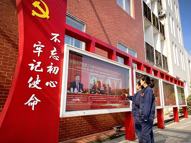 10月20日至23日,中國共產黨第二十屆中央委員會第四次全體會議在北京舉行。全會公報發布后,方大九鋼全體黨員和干部員工第一時間通過微信轉發全會公報,并在宣傳欄醒目位置張貼全會公報內容,廣大員工通過觀看宣傳欄、組織召開集中學習會、開展黨員每周思想政治學習等方式,第一時間全文學習全會內容,深入理解全會重要精神。與此同時,該公司結合年度重點工作任務和崗位實際,做到“真學真懂真信真用”,力求將學習成果轉化為推動工作的具體方案,確保全會精神落地見效。圖為方大九鋼職工利用工余時間觀看宣傳展板。(歐青/文 黃小明/攝)