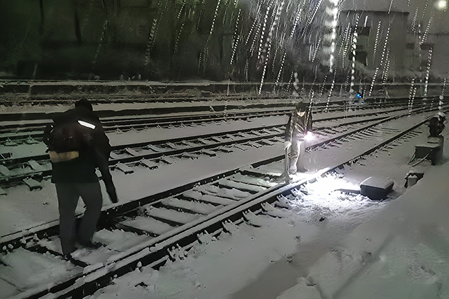 11月27日,吉林通化今年冬季第一場強降雪席卷首鋼通鋼公司廠區。面對這場突如其來的雪情,通鋼各單位快速響應,迅速開展清雪行動,確保廠區生產經營平穩有序。為保障鐵路運輸這一生產“大動脈”暢通,通鋼運輸公司立即啟動應急預案,組織應急隊伍投身鐵路線路及道岔除雪作業。據統計,此次降雪,通鋼運輸公司累計出動除雪人員41人次,清掃道岔68組,以高效作業確保鐵路運輸通道安全暢通,為生產原料供應和產品外運提供堅實保障。圖為通鋼運輸公司職工正在冒雪清除軌道上的積雪。(柳雪飛 攝)