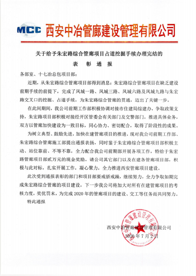 西安管廊朱宏路項(xiàng)目收到業(yè)主表彰通報(bào)
