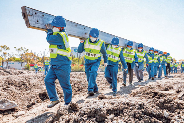 圖為中冶寶鋼方艙醫院的建設者靠手抬肩扛運送鋼結構橫梁。