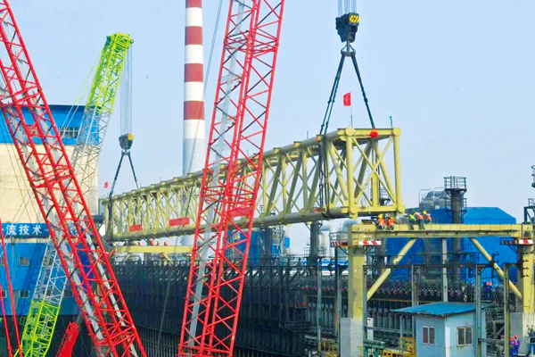 圖為河北華豐焦?fàn)t煙氣治理建筑安裝項(xiàng)目鋼桁架吊裝現(xiàn)場(chǎng)。 (中國(guó)五冶 供圖)