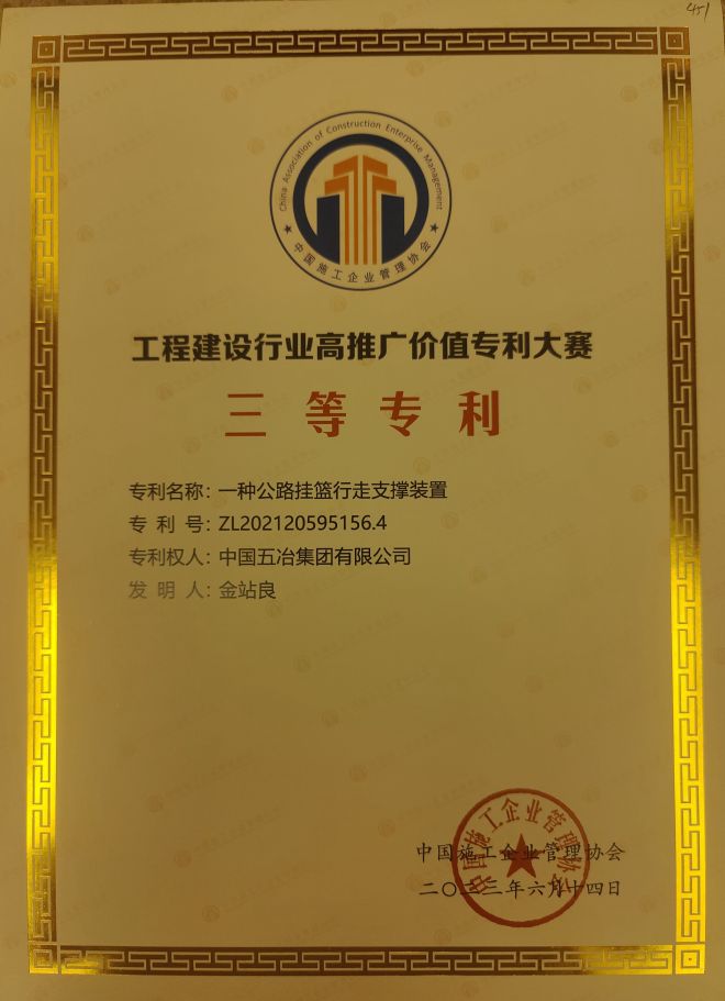 “一種公路掛籃行走支撐裝置”榮獲“工程建設行業(yè)高推廣價值專利大賽”三等專利。本發(fā)明專利公開了一種公路掛籃行走支撐裝置的使用方法的研究應用,其創(chuàng)新點在于提供了一種無需拆裝千斤頂?shù)墓窉旎@行走支撐裝置。本專利改變原有的施工思維方式和技術效果,降低了勞動強度和作業(yè)時長,消除了安全隱患。從公路掛籃操作過程中,制定了一種公路掛籃行走支撐裝置的研制說明書和操作方法,在公司相關產(chǎn)品或技術布局的系列專利申請中具有小、新、實用性強等鮮明特點,應用范圍較為廣泛,具有較高的推廣運用價值。