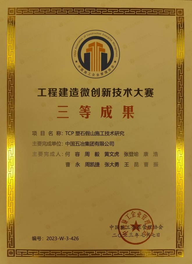 “TCP 塑石假山施工技術研究”榮獲“工程建造微創(chuàng)新技術大賽”三等成果。中國五冶集團華東公司承建的2021年揚州世界園藝博覽會世博園項目核心景觀“夢幻疊瀑”設計了仿真實石型結構造型,為營造出流水瀑布的真實感,大體積假山結構部分采用了TCP材料建造,并對該結構開展了設計、加工、施工的技術攻關研究,形成了多項自主創(chuàng)新技術。