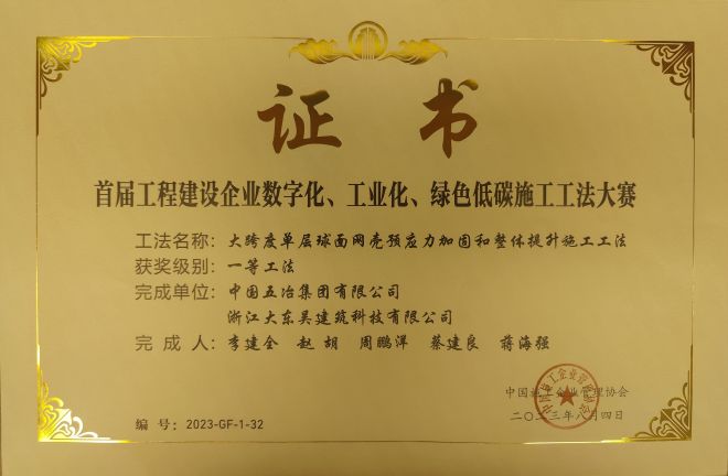 “大跨度單層球面網(wǎng)殼預應力加固和整體提升施工工法”榮獲“首屆工程建設企業(yè)數(shù)字化、工業(yè)化綠色低碳施工工法大賽”一等工法。中國五冶集團華東公司承建的太陽酒店項目穹頂提升過程中運用了該工法,其技術原理是通過預應力鋼索對提升網(wǎng)殼單元進行臨時加固,使提升網(wǎng)殼單元形成弦支網(wǎng)殼結構,確保網(wǎng)殼結構提升過程中的穩(wěn)定性;在球體鋼結構頂部設置提升支架和上提升點液壓千斤頂,在網(wǎng)殼結構上設置下提升點,通過計算機控制提升系統(tǒng)實現(xiàn)對網(wǎng)殼結構進行整體提升。