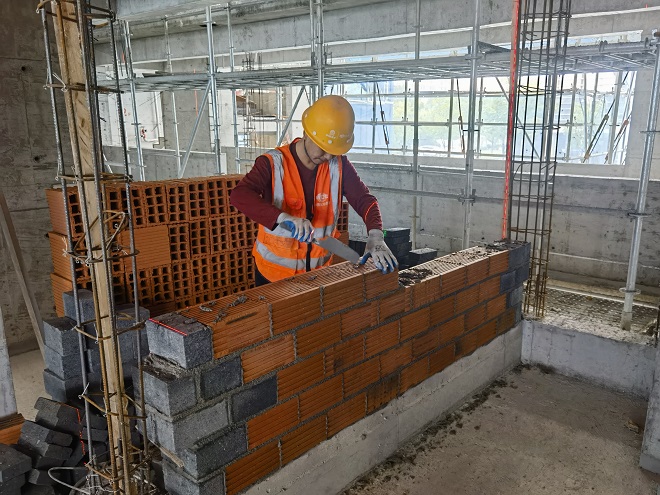 施工現場,來自專業分包隊伍的5支砌筑小組爭分奪秒,亮絕活、比技能,挑磚、測量、切割、抹灰、砌筑……動作嫻熟而不失節奏,在規定時間內完成墻面砌筑。最終經過現場評委從多個方面綜合打分,評選出前三名及優秀獎獲得隊伍。