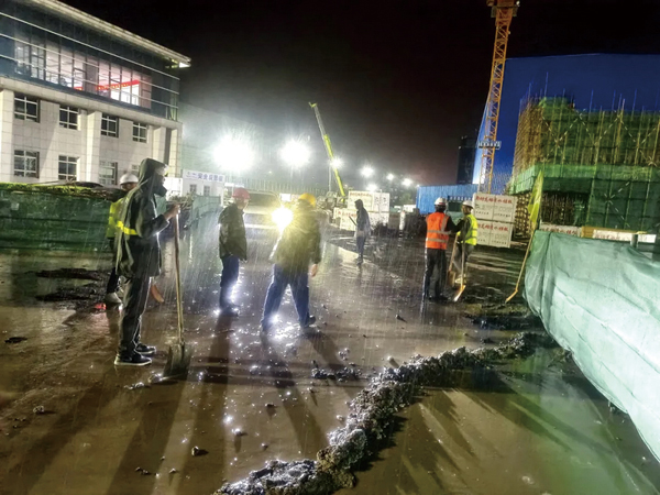 面對狂風驟雨增添安全隱患的現實,該項目部突擊隊員們連夜在暴雨中進行“無死角”排查,為每一臺“電疙瘩”包裹雨衣,確保電氣設備不受潮濕侵害。夜幕中,大家搬機器、扛沙袋,對基坑圍護進行加固,同時通過增設排水溝與沙袋圍堰,有效引導雨水流向指定排水系統,減少積水對地基的侵蝕。經過6小時不間斷奮戰,大家泡白了手指、磨破了肩膀、充滿了疲憊,但臉上還是洋溢著勝利后的喜悅和自豪。