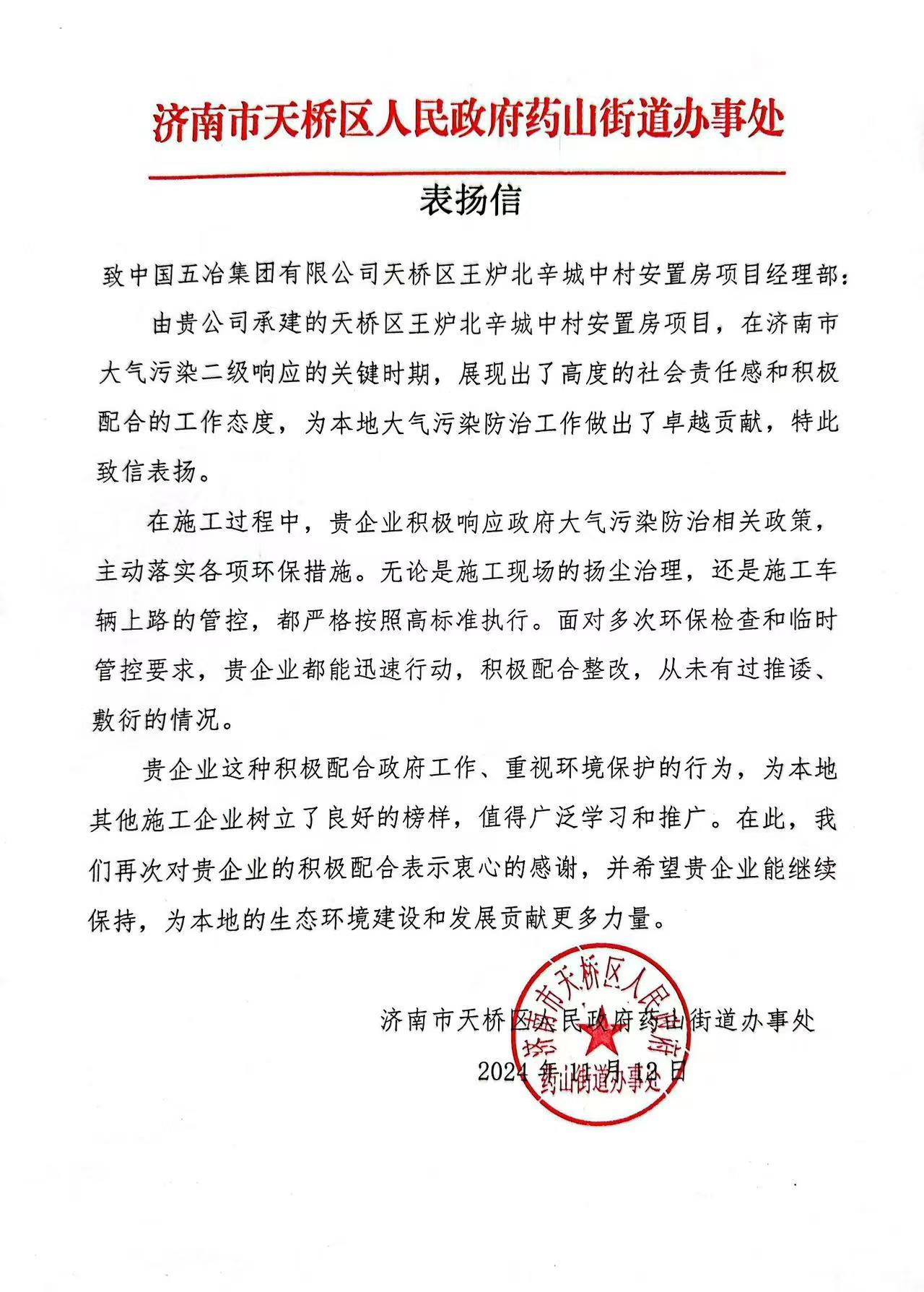 近日,中國五冶濟南市天橋區王爐北辛城中村安置房項目收到了一封來自濟南市天橋區人民政府藥山街道辦事處的表揚信。信中對項目團隊在濟南市大氣污染二級響應期間所做出的努力和貢獻表示肯定,并對項目團隊所展現的社會責任感和積極配合政府工作態度的給予高度贊揚。