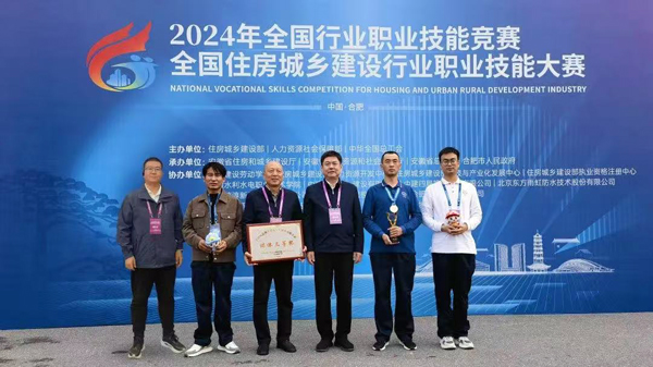 圖為在2024年全國行業職業技能競賽——全國住房城鄉建設行業職業技能大賽上,中國二十二冶冶金公司員工曹發賓(左二)榮獲砌筑工賽項個人三等獎。 (中國二十二冶冶金公司 供圖)
