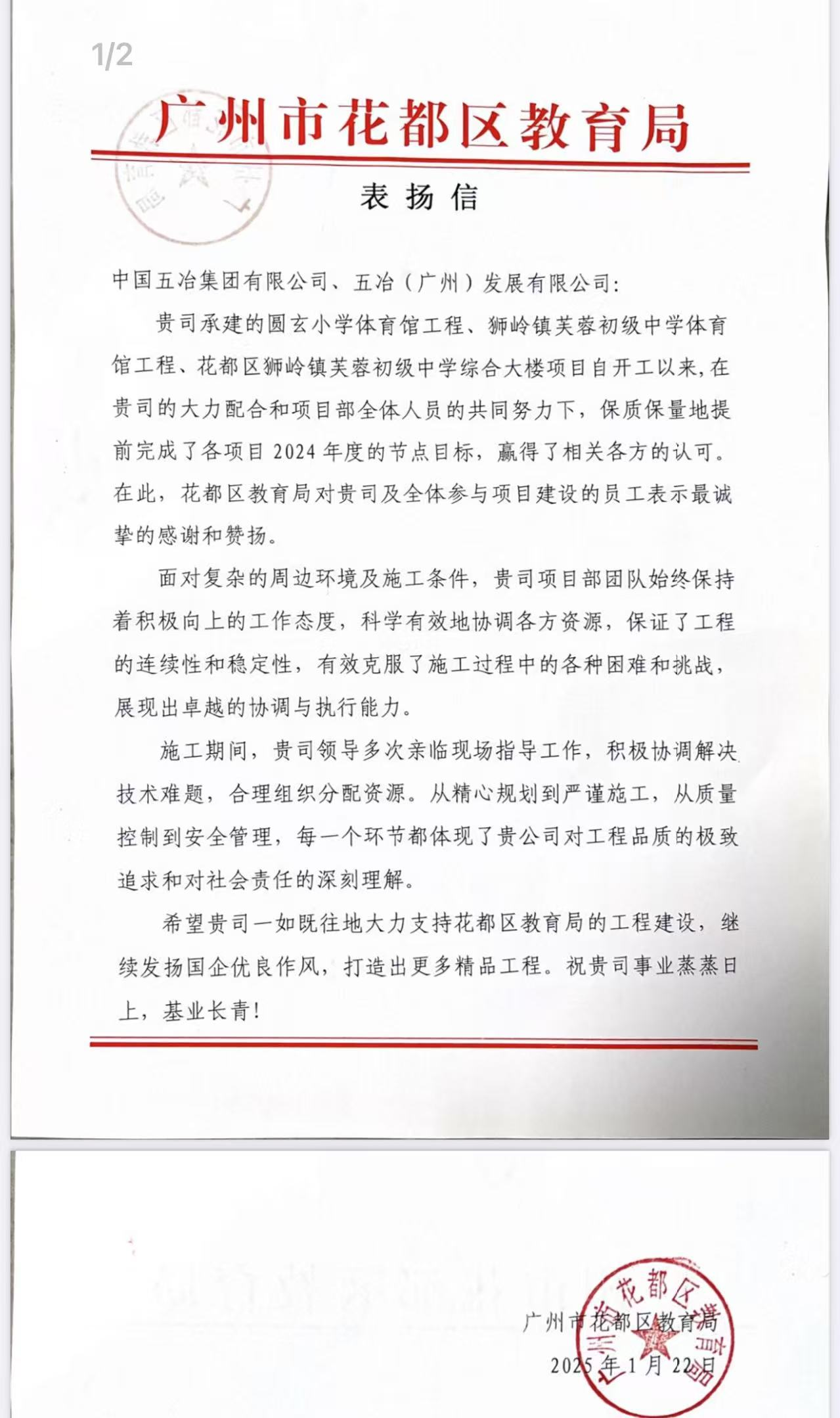 芙蓉中學(xué)綜合樓、體育館項(xiàng)目和圓玄小學(xué)體育館工程項(xiàng)目收到來(lái)自廣州市花都區(qū)教育局的表?yè)P(yáng)信,信中指出:面對(duì)復(fù)雜的周邊環(huán)境及施工條件,項(xiàng)目部團(tuán)隊(duì)始終保持著積極向上的工作態(tài)度,科學(xué)有效地協(xié)調(diào)各方資源,有效克服了施工過程中的各種困難和挑戰(zhàn)。施工期間,公司領(lǐng)導(dǎo)多次親臨現(xiàn)場(chǎng)指導(dǎo)工作,積極協(xié)調(diào)解決技術(shù)難題,合理組織分配資源。從精心規(guī)劃到嚴(yán)謹(jǐn)施工,從質(zhì)量控制到安全管理,每一個(gè)環(huán)節(jié)都體現(xiàn)了貴公司對(duì)工程品質(zhì)的極致追求和對(duì)社會(huì)責(zé)任的深刻理解。