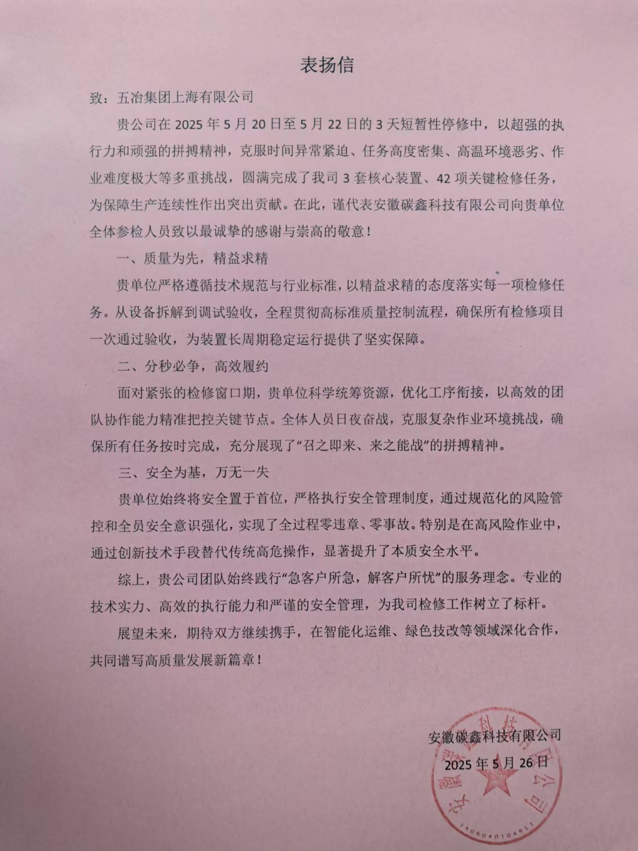 近日,中國五冶集團工程技術服務公司淮北作業部收到業主單位安徽碳鑫科技有限公司錦旗及表揚信,對淮北作業部在5月份短暫性停修中展現出的專業素養、高效響應和卓越服務給予高度肯定。